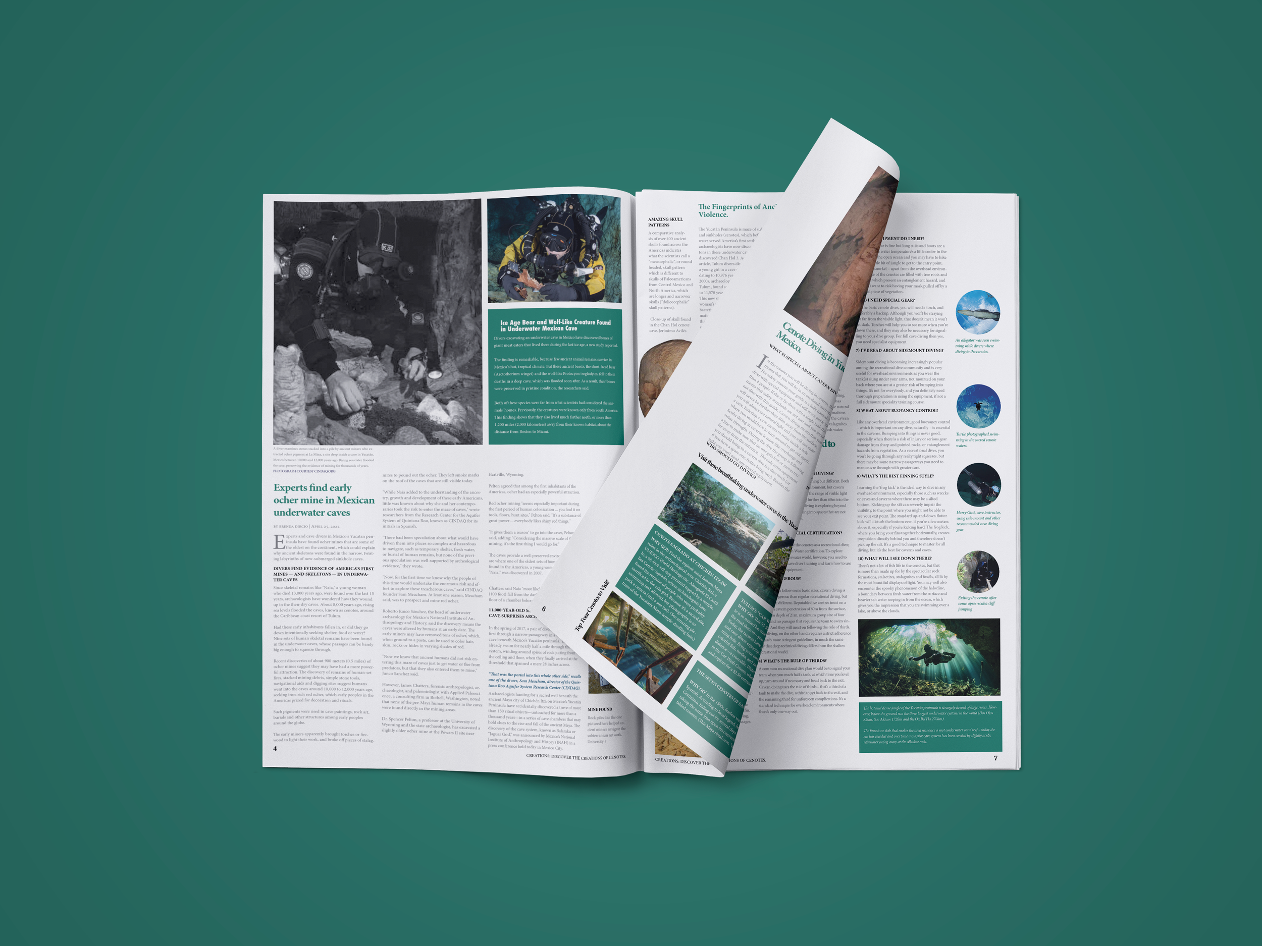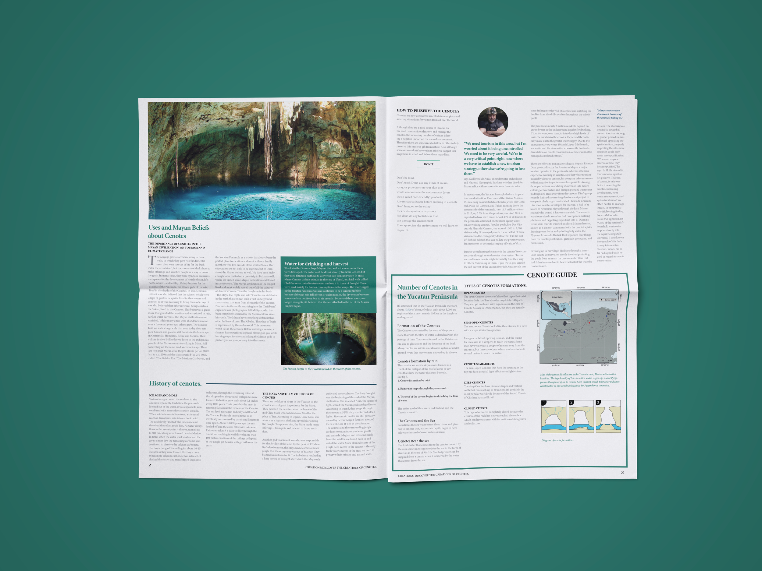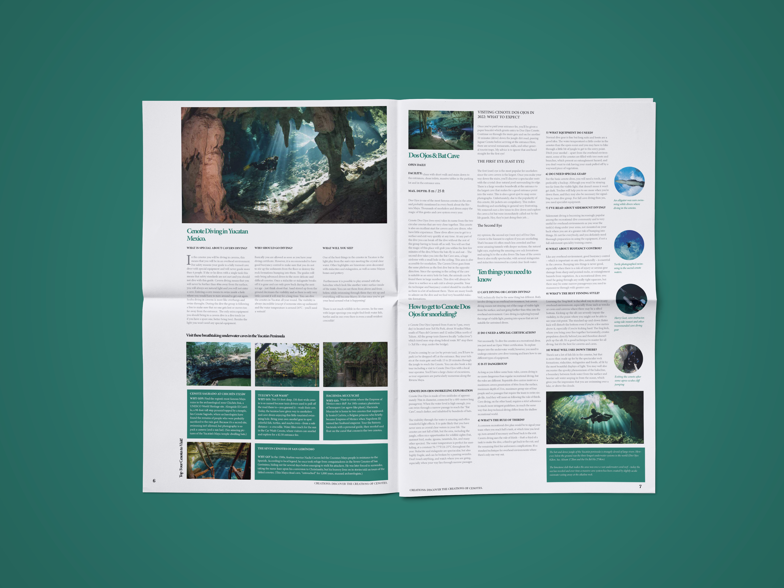 A 8 Page spread about the amazing creations of Cenotes. They are mainly found in Mexico, Tulum. You will read about the discoveries and the history of these beautiful creations.